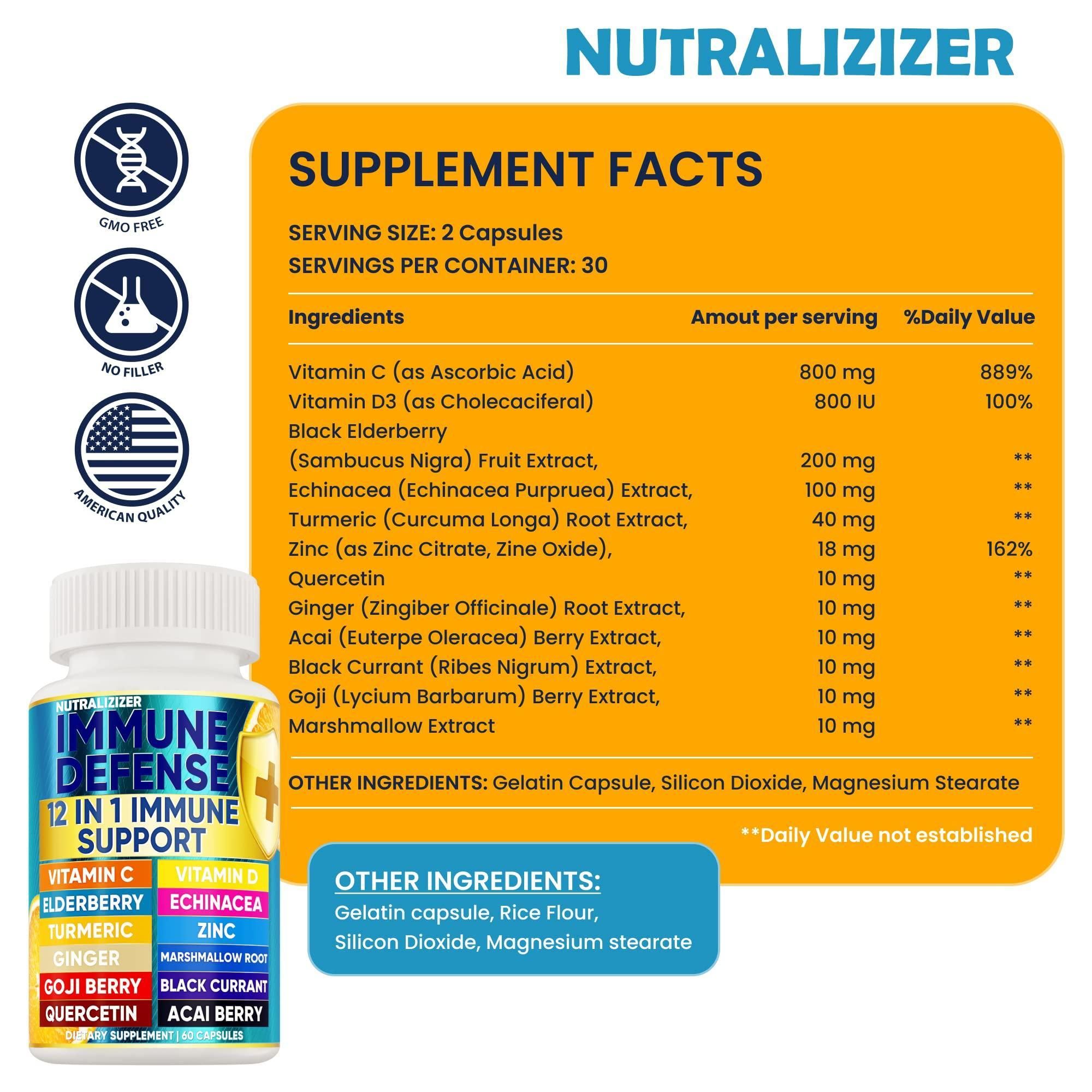 1.12-in-1: immunity vitamins combine 12 potent nutrients and natural ingredients including zinc, vitamin , vitamin , quercetin, echinacea, and acai to support your immune system & overall health. immune support: immune vitamins are rich in vitamin c to help you feel well all year long. besides, immune supplement has ginger & turmeric, which help balance energy levels and stay healthy & active. herbal supplement: supplement for immunity defense is rich in nutrients to support