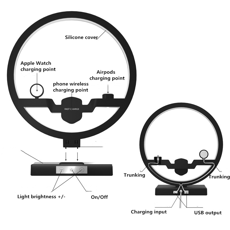 DescriptionInput : 9V/3.5A at least2 USB Output : 5V/1ALed Power: 0.1-6WWireless output : 5W 7.5W 10WCharge distance : 2-6mmSize : 300*95*325mmProduct weight : 675gWork frequency : 110*205KHZConveter : >73%Compatible ModelFit for All Smartphone which support QI wireless charger. If your phone do not have wireless charger function,need to use wireless charger receiver. For Apple Airpods (original)/For Apple watch 1/2/3/4/5Notice1. The wireless charger for iwatch and airpods are not included , you can install your original charger of iwatch and airpods on charger.