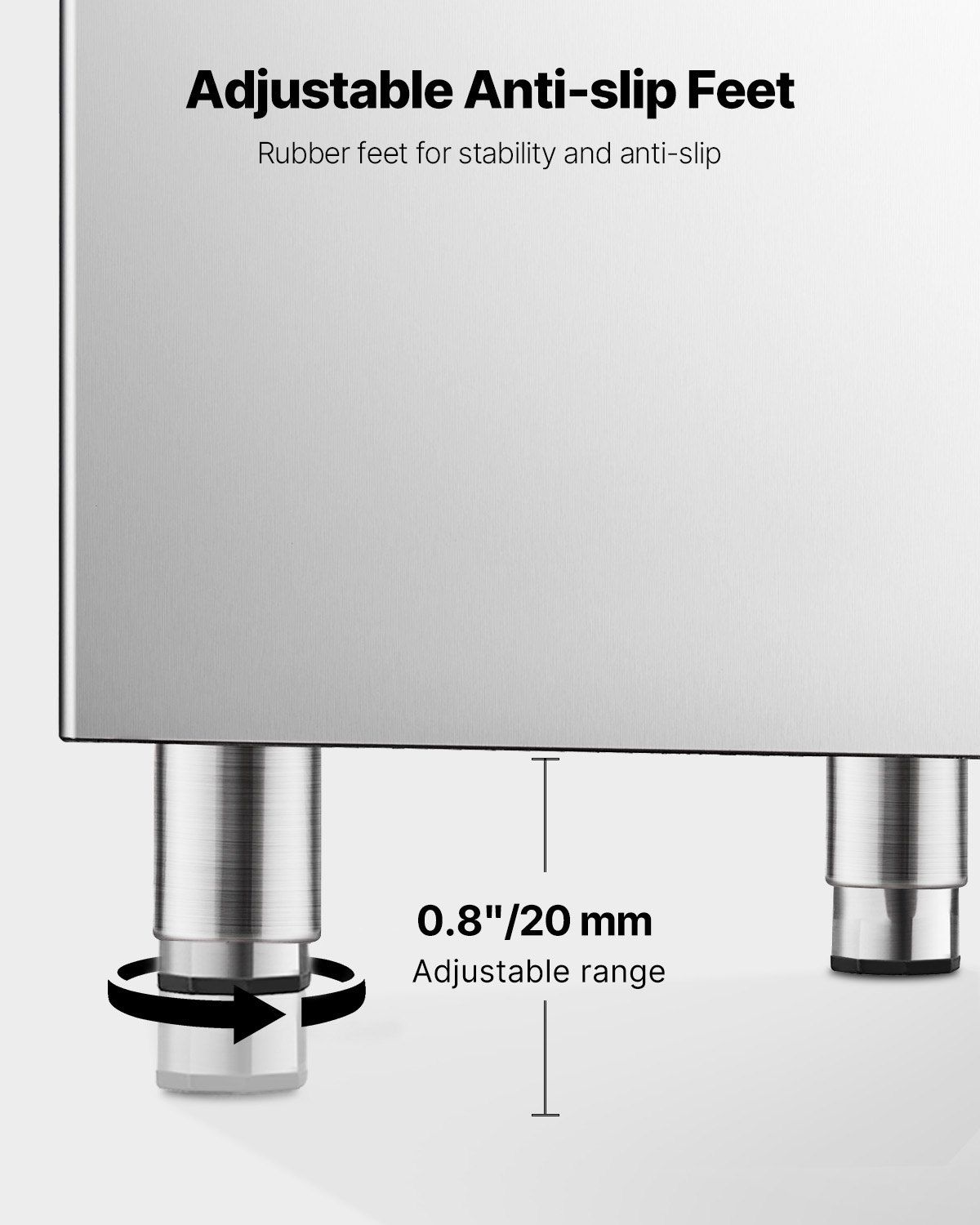 3.Adjustable Rubber Feet: The ice bin comes with adjustable feet, providing a height range of 20 mm / 0.8″. The rubber design at the bottom provides anti-slip and shock-absorbing features, protecting the floor.