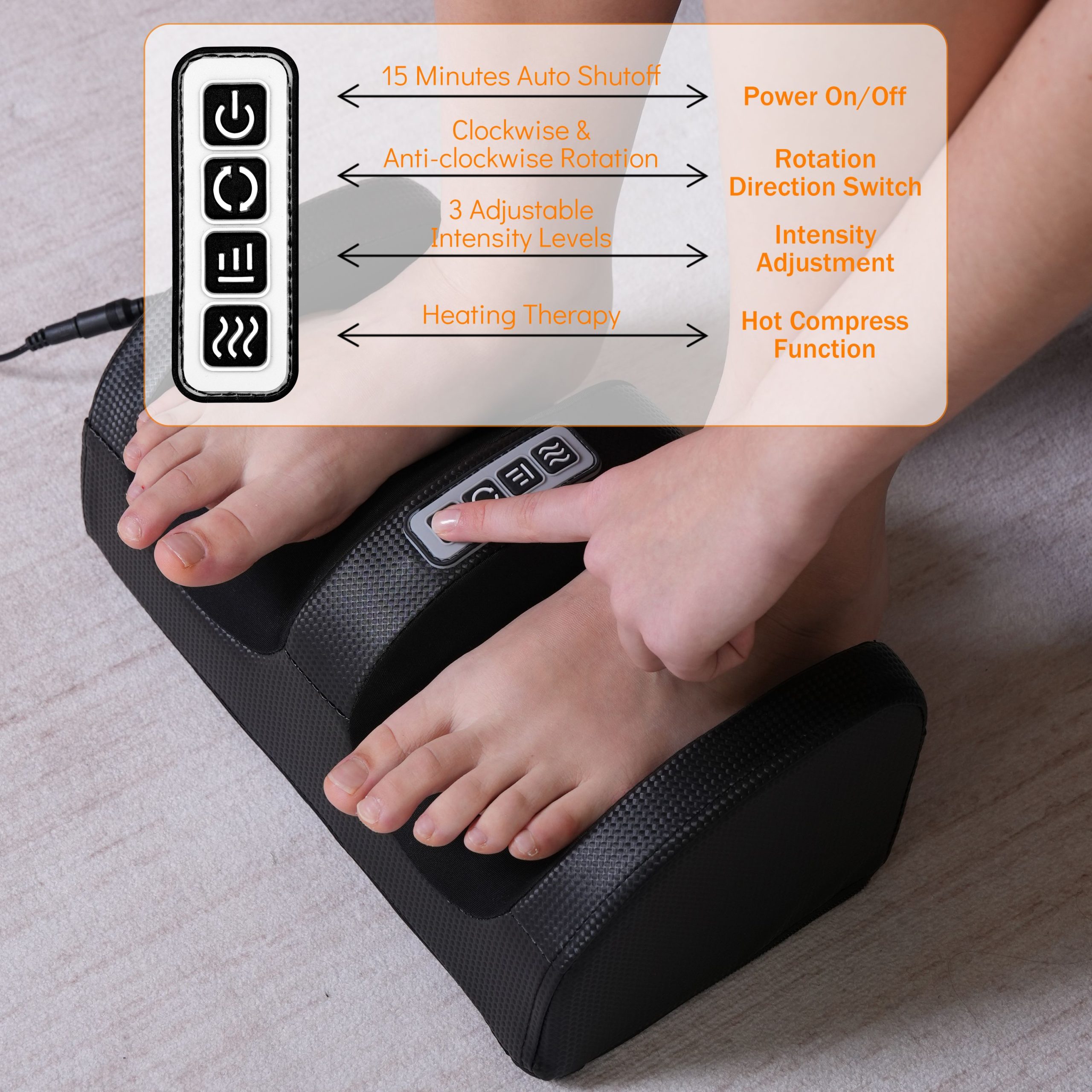 2.Easy To Use: The portable mini foot massagers weighs only 2.6 pounds, making it easy to move and store. After plugging in the power, electric foot massagers can be turned on, and 1 button can control the heat therapy, direction and massage intensity, and the operation is simple.