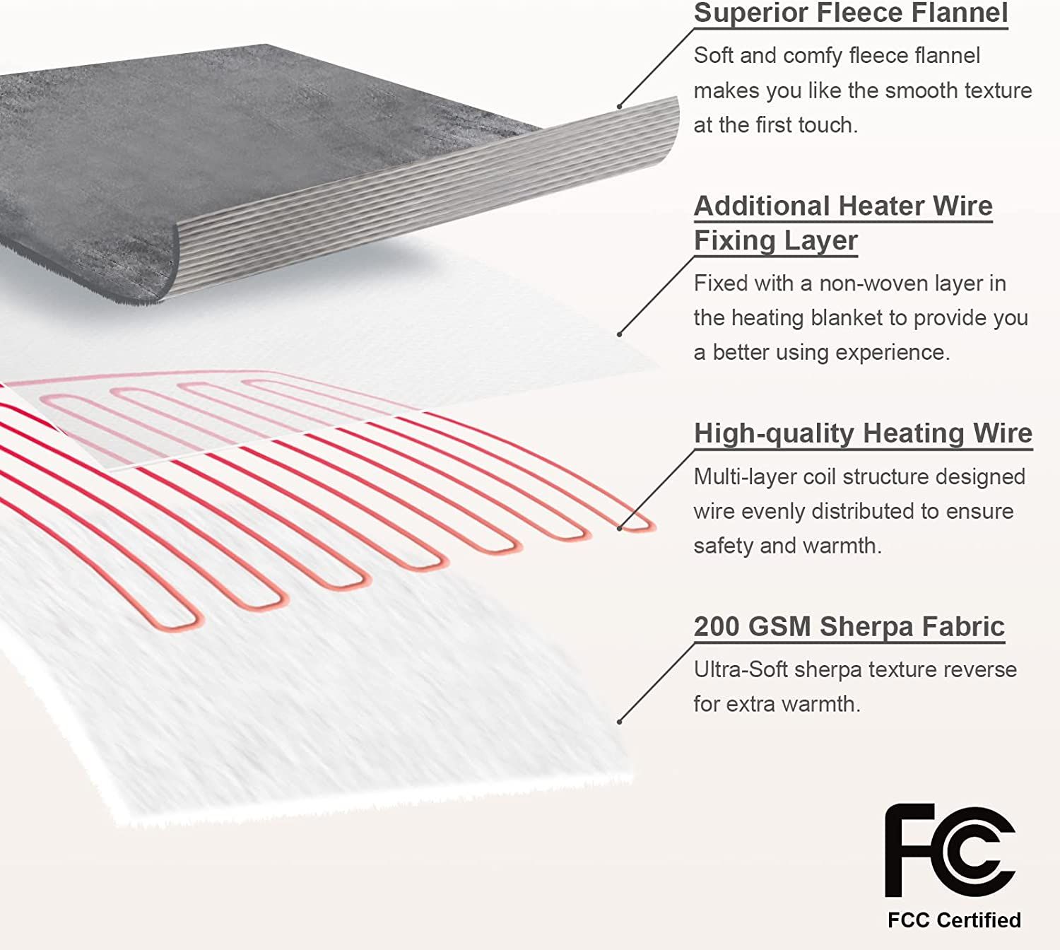 The automatic shut-off function allows you to enjoy with peace of mind.Safety Ensured: The high quality heating wire is evenly distributed in the electric blanket; and there is a fixed layer to prevent the wire from shifting.
