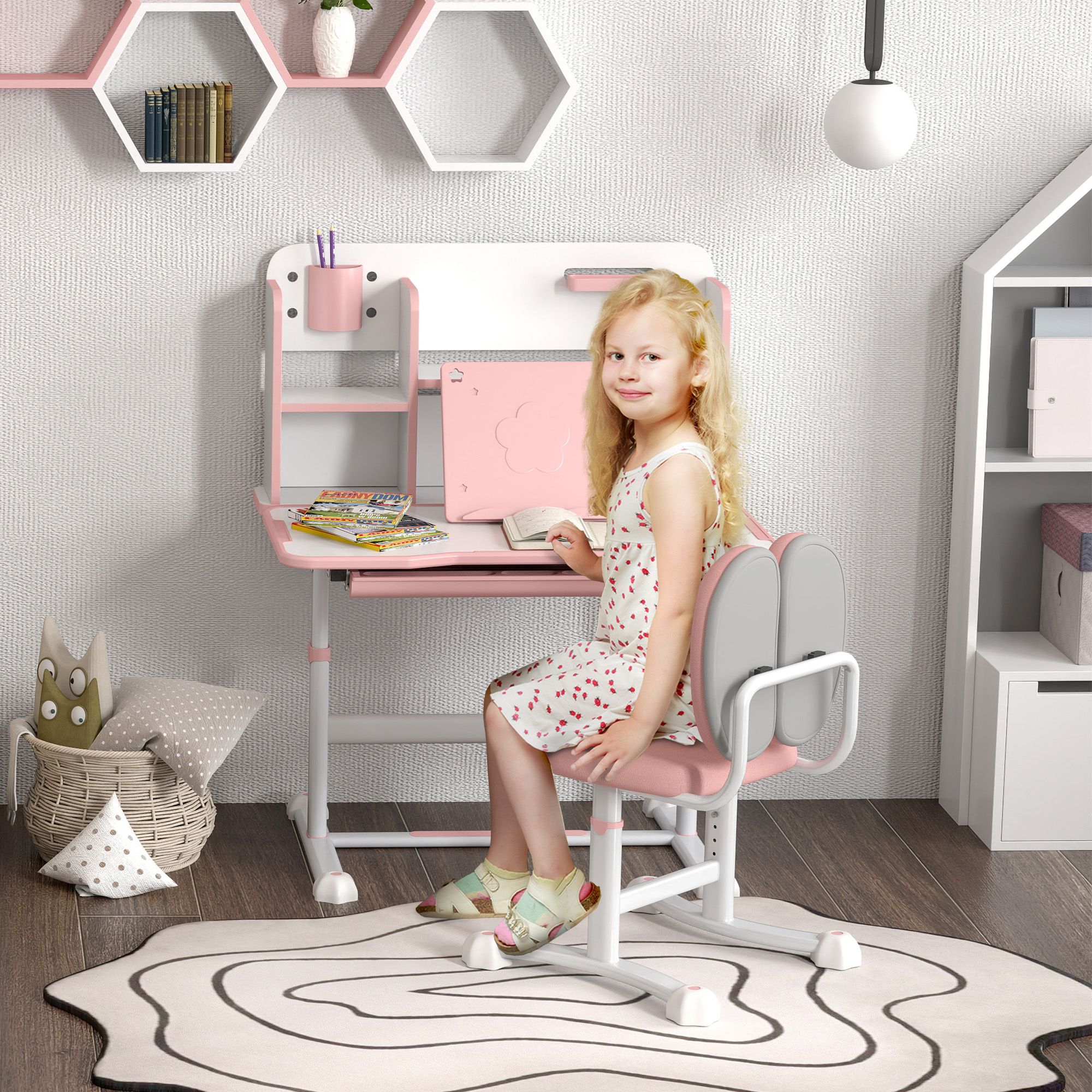 Discover the Qaba kids desk and chair set, crafted with an MDF tabletop and strong steel legs. The spacious surface tilts from 0-45° for optimal posture, while adjustable anti-slip foot pads ensure stability. Great for everything from art projects to homework, this student desk and chair set is a must-have for any young student’s study space.Features:- MDF tabletop and steel legs ensure lasting stability- Spacious tabletop tilts 0-45°, reducing neck and back strain- The adjustable height of the table and chair caters to growing children- Ergonomic chair with foam padding supports extended comfort- Integrated storage options including bookshelf, drawer, and pen holder- Extra reading rack encourages proper posture to protect eyesight- Adjustable anti-slip foot pads maintain balance on uneven surfaces- Assembly required Specification:- Color: Pink, White- Materials: Polypropylene, MDF, Steel, Polyester- Table Dimensions: 31.5" L x 21.7" W x 36.4" -42.3" H- Chair: 20.1" L x 18.1" W x 27.6"-30.7" H- Adjustable Seat Height: 15" -18.1" H- Adjustable Tabletop Height: 21.9" -27.8" H- Drawer: 21.3" L x 14.2" W x 1.6" H- Chair Backrest: 6.5" W x 1.2" D x 12.2" H (Single Piece)- Reading Stand: 11.6" L x 8.5" W x 1" H- Weight Capacity: 176 lbs. (Table). 220 lbs. (Chair). 11 lbs. (Drawer)- Recommended Age: 3-12 Years- Qualified Age: Over 3 Years- Item Label: 312-124V80PKPackage Includes:- 1 x Kids Desk and Chair Set- 1 x Square Slot- 1 x Pen Holder- 1 x Reading Rack- 1 x Hand Crank- 1 x Manual