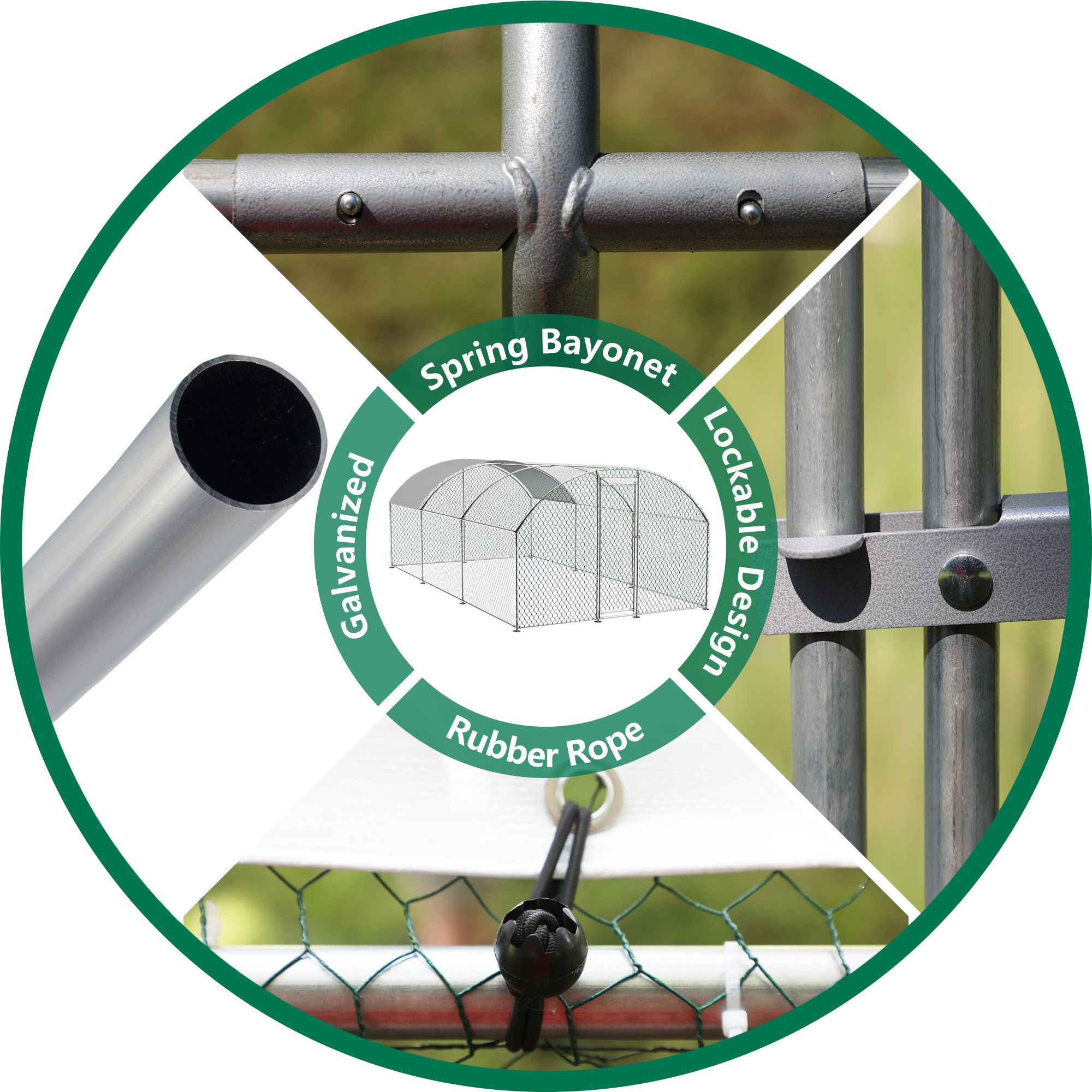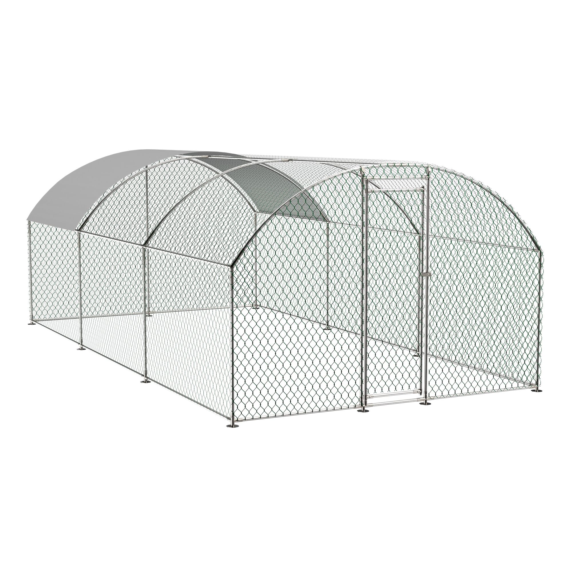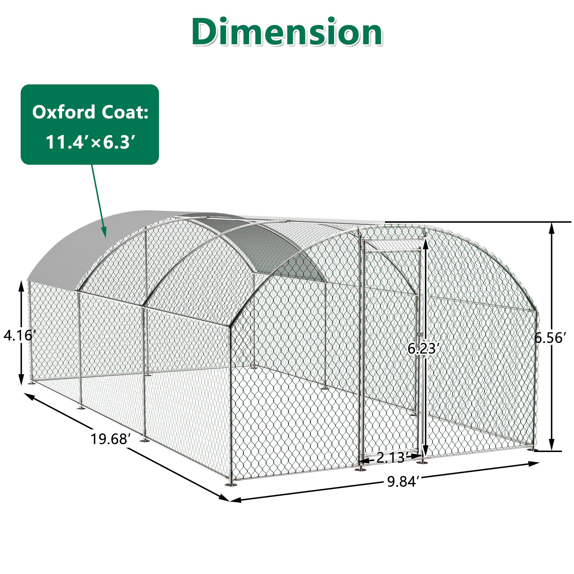 DescriptionOur chicken run manufactured with high quality steel frame, including ground nails, so that the fence can better fixed to the ground.solid enough to keep the poultry from escaping and secure from predators. And this hen run house is also stably stationed to withstand the wind and snow weather.Featuring a durable sun and rain-proof tarp on the top, it is protective for the steel frame, wire mesh and animals under its cover. And the tarp is sturdy enough to avoid tear up or fade over time.With hexagonal wire mesh and the small gaps between meshes, you can prevent your chicken from some predators to make them safety.The spring clasp design requires no-welding for your quick assembly with this large metal chicken run. You can easily understand the installation with a complete set of components and simple instructions we offered.Lockable chicken run house suitable for a variety of animals like for chickens, rabbits, ducks and more.This walk-in metal poultry house has a spacious area for the animal to play and rest in the backyard garden and farm settings.Specification:ColorAs the picture showMaterialGalvanized metal+ PVC coated hexagonal wire meshTarp MaterialPolyethyleneMesh Size1.38 x 1.38 inchDoor Measurement( W x H)2.13 x6.23 ftOverall dimension9.84’L x 19.68’W x 6.56′ fttrap size11 x 6.1ftPVC Wire diameter1 mm