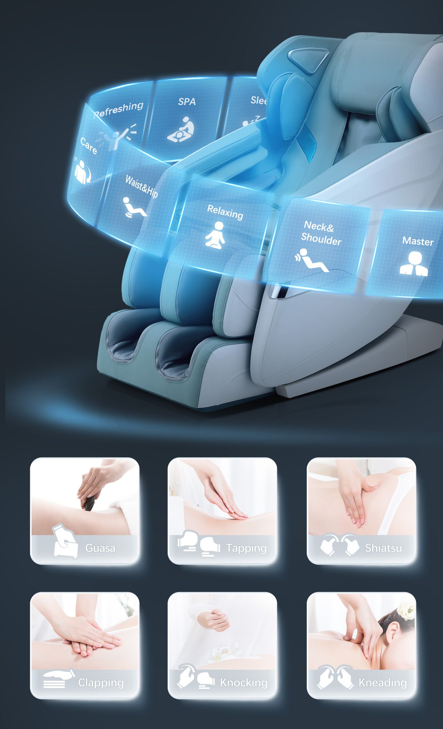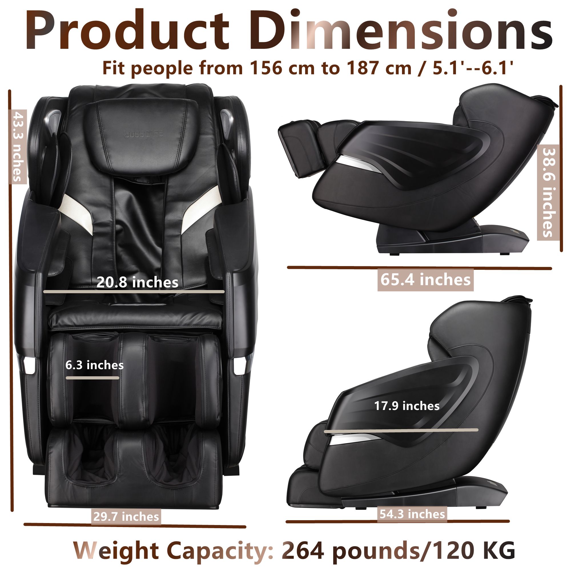Heating on Abdomen, Waist & Back]Heating wrap in front and graphene heating in back, make you feel warm both in back and abdomen; 55℃ Constant temperature heating: targeted heat gently soothes the back to loosen tight muscles, help relieve pain and improve the blood circulation; especially suitable for women, middle-aged and aged people; it is a perfect gift in cold winter[SL Track Massage Chair with Dual Electric Linear Actuators]Wider massage area: Ergonomic Long SL-Track covers from your lower head to upper thigh area and focuses on the neck, shoulders, back, waist, buttocks, longer rails to massage your fatigued muscles and provides you a luxurious massage experience; The wide massage area covers from your lower head to upper thigh to achieve a full-body relaxation[Full Body Airbag Massage Chair with 3D Robot Hands] Flexible & soft 3D massage rollers imitate the touch of the human thumb and helps unclog the main meridians in the back; in manual mode, after selecting the technique (excluding the the Knocking, Kneading Guasha), it has 3 different width to choose to provide a better massage experience for people of different figures. Specifically designed airbag massage to release the tension of shoulders, arms, legs, and calves with different intensity[Zero-Gravity Massage Chair & Automatic Body Scan]After turning on, the massage chair will automatically scan your body. According to your height, shoulder width and weight, it will automatically adjust and match the right points to provide more accurate and comfortable massage for you. The Zero-Gravity Massage gives you the best massage position to free your body, can reduce the burden of heart and back pain, stimulate blood circulation. 3 levels of zero gravity angles for you to choose.[6 Massage Techniques, 12 Auto Modes & Foot massage]12 preset auto modes: master, relaxing, sport care, soft, stretch, sleep, SPA, refreshing, spine care, waist & back, neck & shoulder, slim; 6 massage techniques: Kneading, Shiatsu, Guasha, Clapping, Tapping, Knocking. Foot massage: the multi-bump sole roller helps to release the stress and fatigue of the feet. It could be adjusted to fit people from 160 cm to 187 cm / 5.3 feet–6.1 feet. Footrests extended for the taller about 16 cm/ 6.3′[Pre-assembled, Space Saving & Safe Delivery]This 3D massage chair is fully assembled in advance. Space saving design: wall clearance of 2 inches/5 cm. The package can be delivered directly to the door of a single house; if the delivery location is an apartment building or a residential community, as long as the truck can enter, the package will be delivered to the door of the community[Fashion Appearance & Unique Design]: Simple, unique and stylish wing-shape design– the stylish home style design can match well with other furniture in your room. It is a massage chair and a sofa. HIFI Bluetooth Speaker: enjoy your music while having a massage