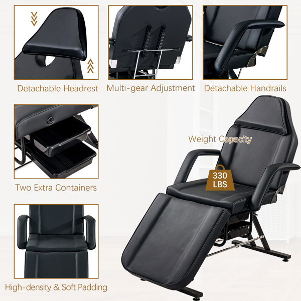 It is a 3-section bed with adjustable backrest and leg rest, which means the bed can lay flat or in a chair-like position.premium quality upholstery ensures comfort and years of durability. It is just perfect for facials, massages, tattoo sessions and body piercings. Non-slip feet can firmly grip the floor for security. Versatile and easy-to-use; it will suit all needs in a beauty salon.Features: