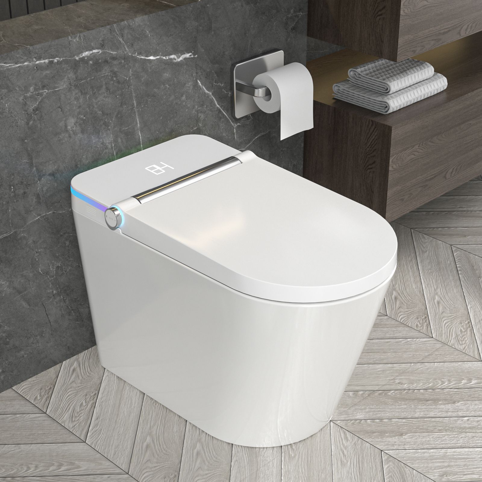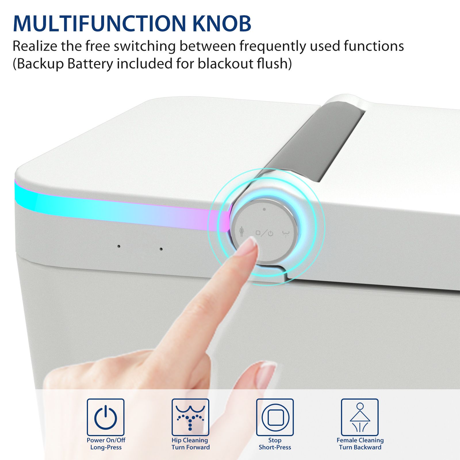 5.This elongated smart toilet can be controlled both by the side knob or the remote control, you can also Flush with Foot Kick, and the one piece smart bidet toilet whit built-in backup battery, so you can flush with the energy of battery during blackout.