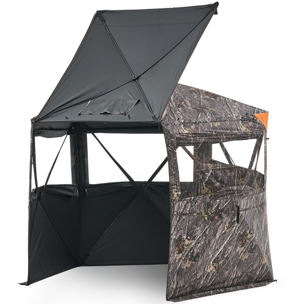 3.Spacious Design: Dimension: 70x70x79 in. With large interior, our turkey deer blind tent can accommodates 4-5 people. Diamond-pattern warning fabric is detachable to increase visibility. It provides standing experience, 270°/360° two-way view