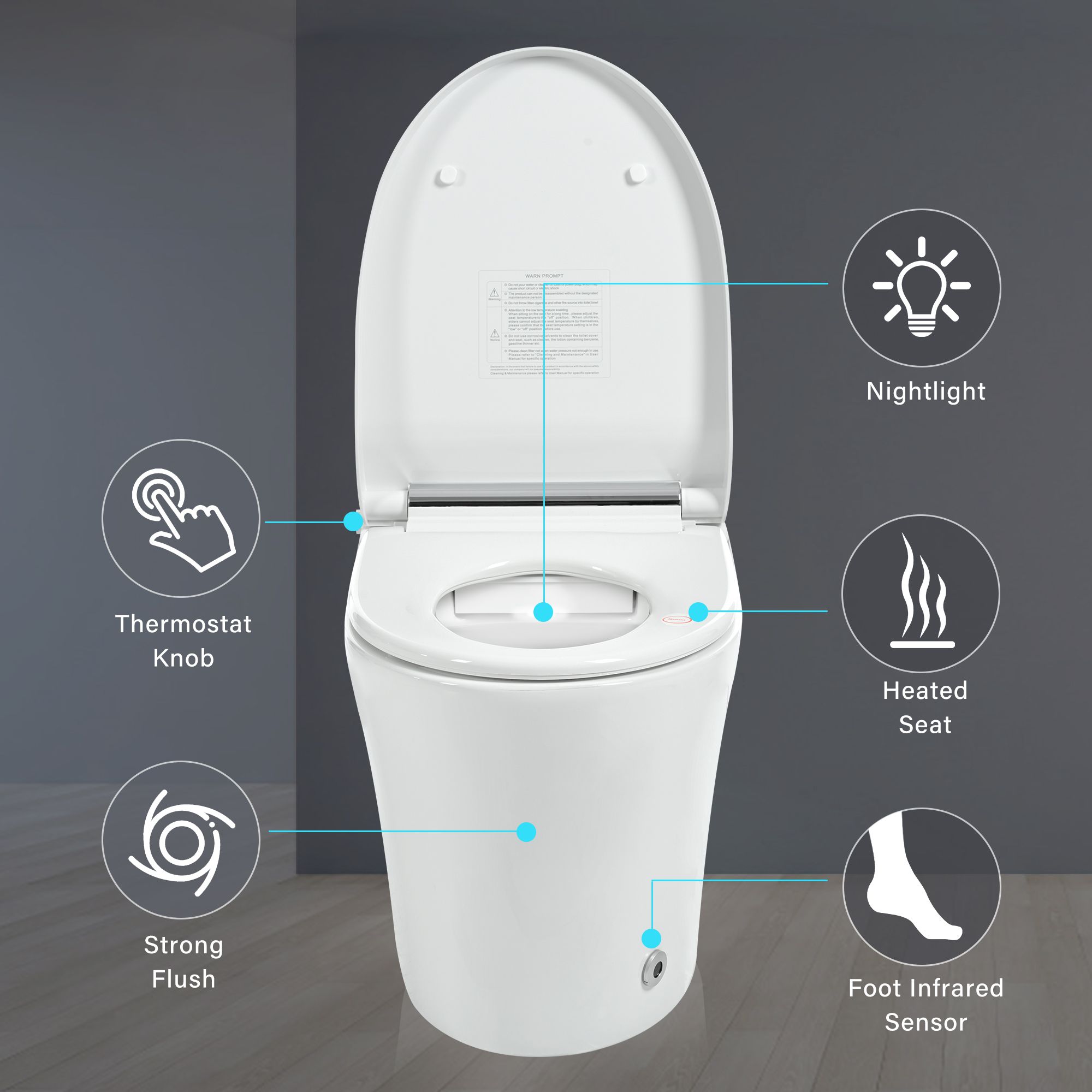Simple Functions To Protect Your HealthElongated Smart Toilet: A one-piece, elongated modern toilet designed for ultimate convenience and comfort.One Knob Control : Easy to use, a knob can be used to control the shut-off of the seat heating, and can also be used to control flushing.Elongated Heated Seat: 4 Levels Adjustable Seat Temp from normal ,91.4℉,96.8℉,to 104℉.Strong Flush: The ceramic bowl’s top and bottom are double-flushed to get rid of stains all at once.Occasionally there is no fear of power failure. The built-in powerful battery can flush water approximately 2500 times.Foot infrared Sensor: Convenience of life while freeing your hands. After using the toilet, flush the toilet through the foot induction method.LED Soft Night Light: It presents a clean color look, and not hard your eyes in the dark. Avoid slipping in the bathroom.