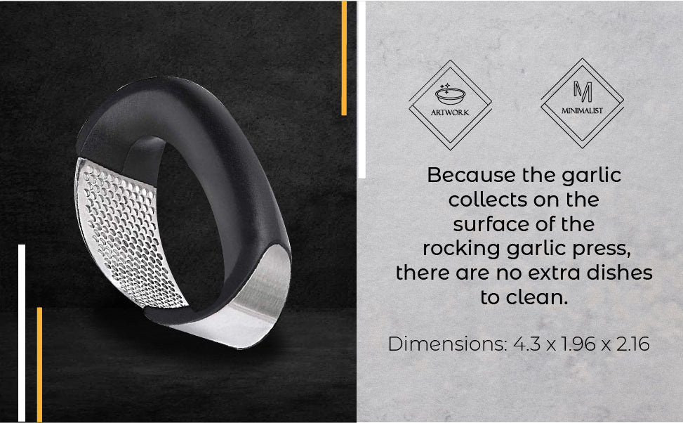 NEW INNOVATIVE ROCKING GARLIC PRESS. This new garlic press with an arc shape and comfortable handle design make squeezing a breeze; even for those with weaker grip or small hands.CRUSH AND MINCE GARLIC EASILY with a slight back-and-forth rocking motion; easily crush or mince garlic in half the time!100% PREMIUM STAINLESS STEEL. Our garlic press is very durable; corrosion-resistant; and will not rust or break.SUPER EASY CLEAN-UP AND STORE – Because the garlic collects on the surface of the rocking garlic press; there are no extra dishes to clean.Quick details:Dimensions:4.3 x 2.2 x 2.0 inchesWeight: 3.9 oz.